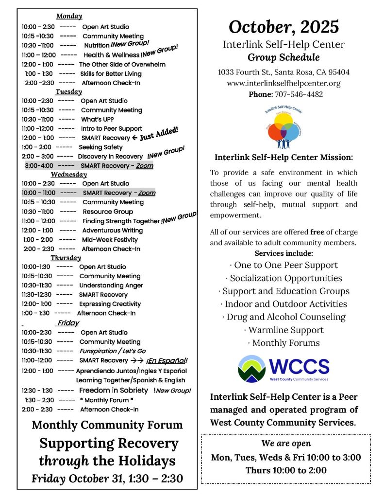 Interlink Self-Help Center is peer operated & funded by the Sonoma County Behavioral Health Division as a program of West County Community Services. We also provide site specific, closed groups to organizations and facilities serving our peer community. Contact Interlink manager for more information. sean.kelson@westcountyservices.org – 707-546-4482 extension 810.