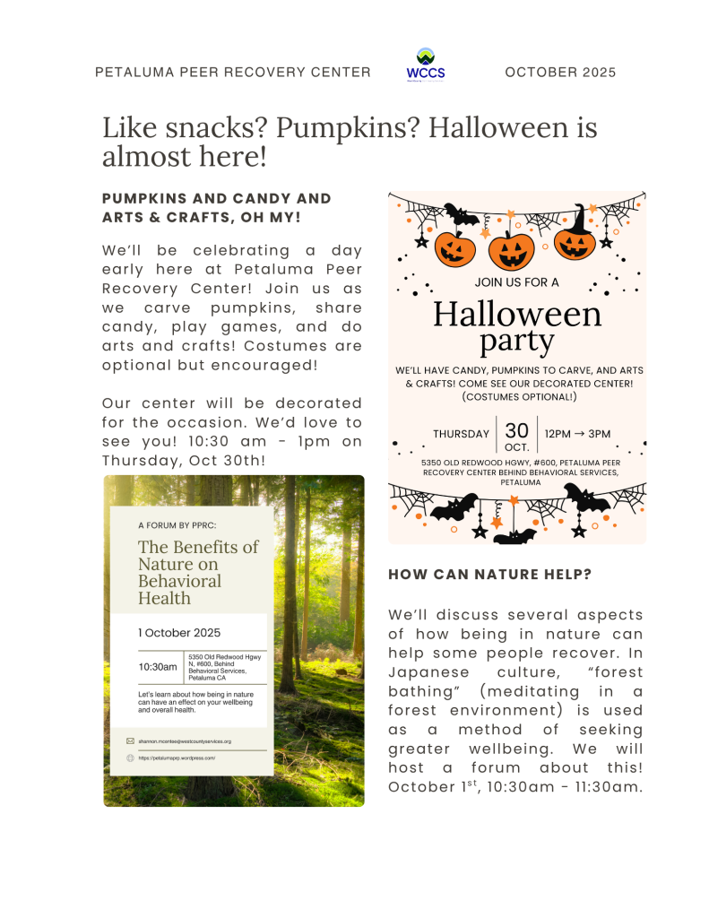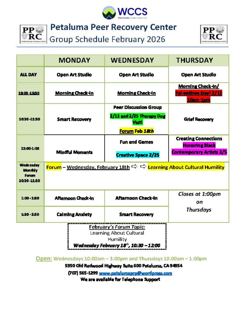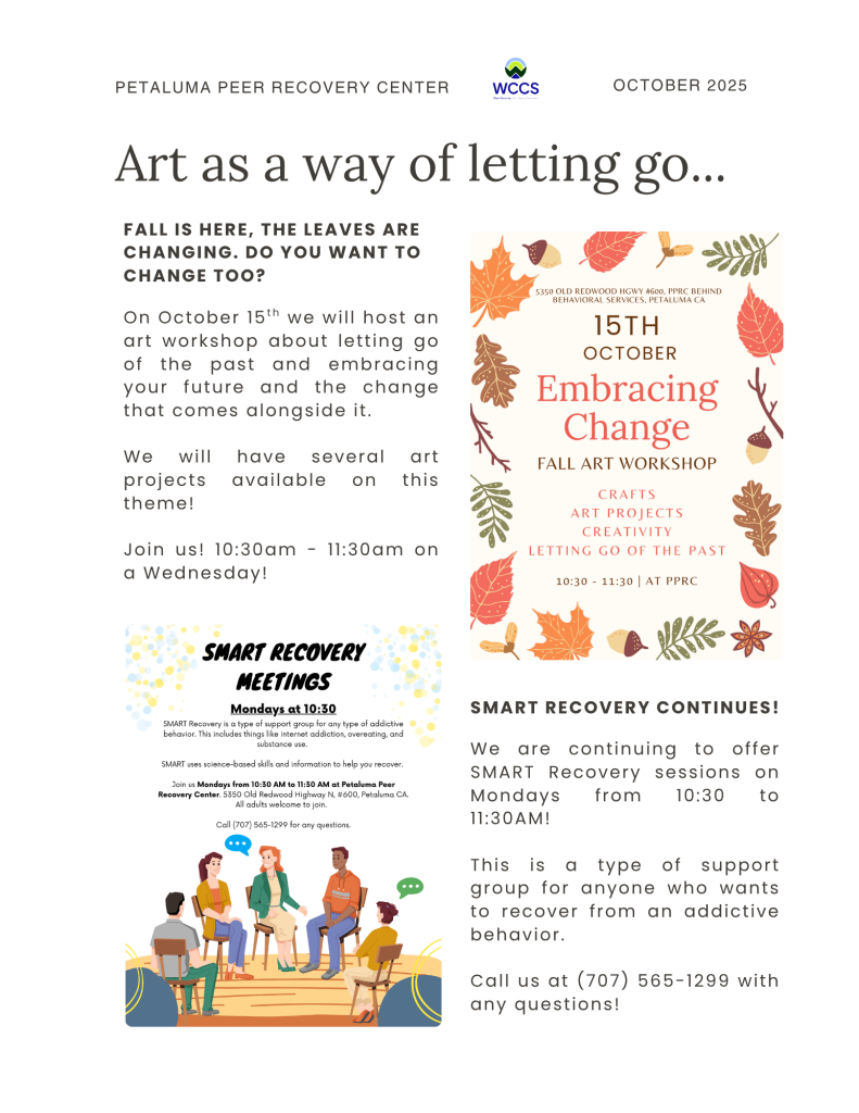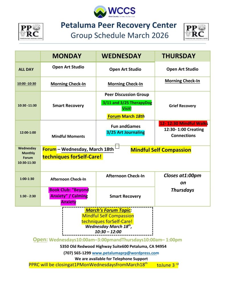 The Petaluma Peer Recovery Center is a peer-run, mental health self-help drop-in center that fosters connection and mutual support. It offers free membership and provides services like one-on-one peer support, creative and craft events, resource navigation, and support groups. The center creates a safe, inclusive environment where individuals facing mental health challenges can explore their well-being through creativity and shared experiences. Open on Mondays and Wednesdays from 10 AM to 3 PM, and Thursdays from 10 AM to 1 PM, additional support is also available through their warmline.